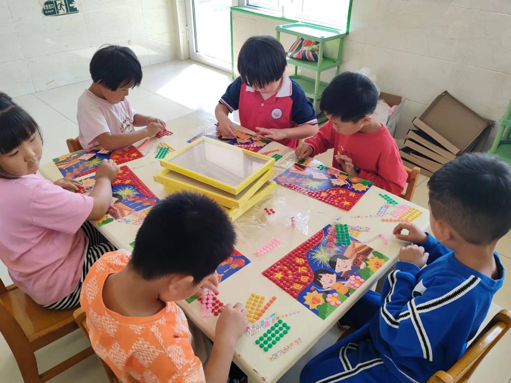 随后,社工分发制作爱国主题纽扣画的材料,并耐心、细致地教给每个儿童关于国庆节纽扣画的制作流程,小朋友们听得聚精会神、津津有味。摆放、粘贴、相框,孩子们一步步跟着制作,有不明白的地方还积极向老师们询问。