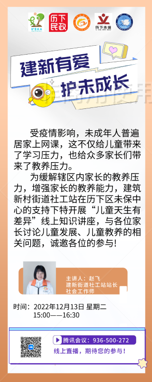 受疫情影响,孩子普遍居家上网课,这不仅给儿童带来了学习压力,也给家长们带来了教养压力。为缓解辖区内家长的教养压力,增强家长的教养能力,建筑新村街道社工站在历下区未保中心的支持下开展以“儿童天生有差异”为主题的线上知识讲座,由社工赵飞作为本次讲座的主讲人带领家长们一起讨论儿童发展、儿童教养的相关问题。