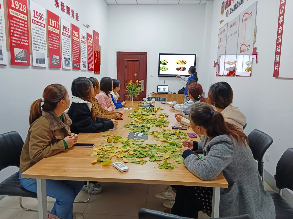 美里新居社区会议室里,在社工的指导下,参与者们利用在社区内收集的银杏树叶,结合个人创意,制作出一束束形态各异的银杏叶手工花束。大家边制作,边交流心得、分享技巧,现场气氛温馨而活跃。