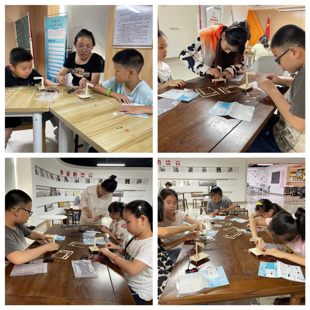 接下来,孩子们在社工一步步地引导下,通过观看制作视频,动手进行了红绿灯的制作。首先孩子们利用木板拼图制作出各式各样的红绿灯模型,随后将电子元件、传感器、热缩管、小灯泡等配件组装在模型里,成功制作出了能够响应不同交通情况的智能红绿灯系统。通过此次活动,孩子们不仅学习了电路知识、编程逻辑,还通过实际操作,体验了科技如何服务于日常生活。