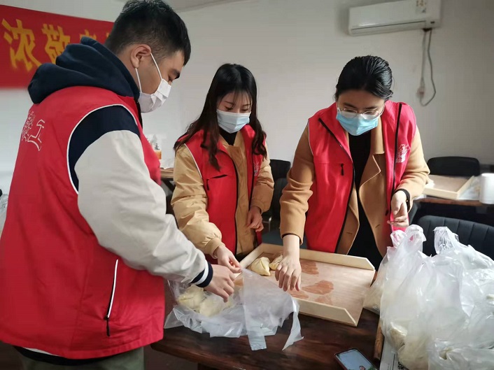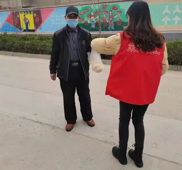 因疫情不能堂食,我们将大包子分拣装到袋子里等待老人前来拿包子。除了可以上门的老人外,还有十来户行动不便的老人无法上门取包子。本着不落下每一位老人的原则,我们拿着包子一家家送上门,让每位老人都能吃上又大又香的包子。