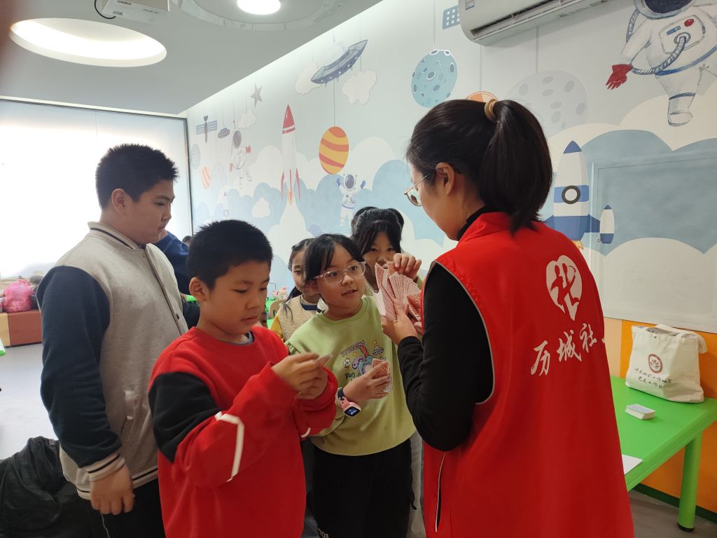 活动伊始,社工先向孩子们介绍了曼陀罗绘画和情绪疗愈卡的使用方法。在曼陀罗绘画环节,孩子们全神贯注,用五彩斑斓的画笔在画纸上描绘出独一无二的图案,将内心深处难以言表的情绪与想法融入其中。紧接着,在情绪疗愈卡的体验中,孩子们抽取卡片,根据上面的提示与引导,分享自己生活中的情绪故事,勇敢地表达内心真实感受。社工在一旁耐心倾听,适时给予温暖的鼓励与专业的引导。