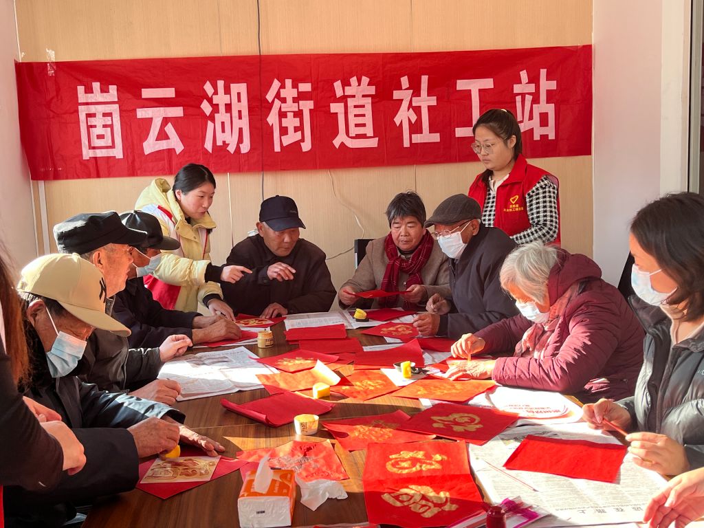 为营造喜庆祥和的新春氛围,弘扬中华民族优秀传统文化,让辖区空巢老人感受传统年俗及传统艺术的魅力,增强社区凝聚力,2024年1月10日,崮云湖街道社工站凝聚五社力量,链接志愿者,联合丹凤社区开展“福字拓印添年味,红纸墨香迎新春”迎春送福活动,带领社区空巢老年人走进非遗文化宝库,共同迎接崭新的一年。