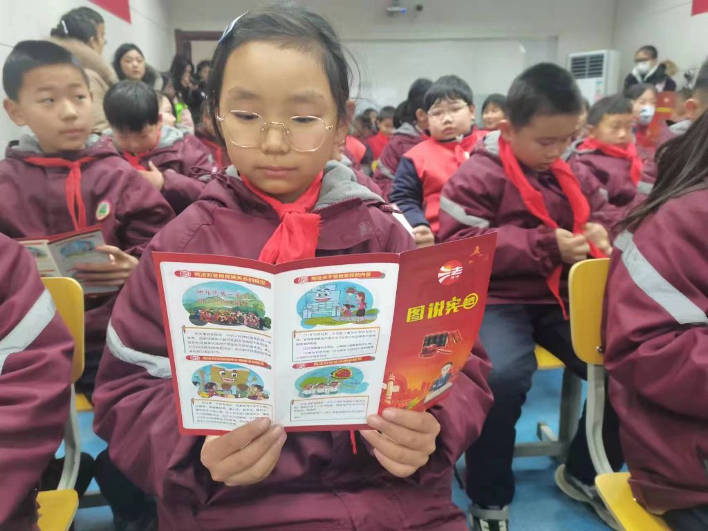 12月20日,五峰山街道中心小学的校园内飘起了宪法知识宣传旗帜,吸引老师和学生们纷纷驻足阅览。社工组织山东工艺美术学院的志愿团队,井然有序地进行专题讲座,发放“图说宪法宣传手册”,志愿者解读了党的二十大报告中“坚持全面依法治国,推进法治中国建设”的内容,从依法治国的重要性到实施策略,帮助师生、家长深入理解国家宪法精神,促进师生、家长法治意识的提高,做知法、尊法、守法的好公民。
