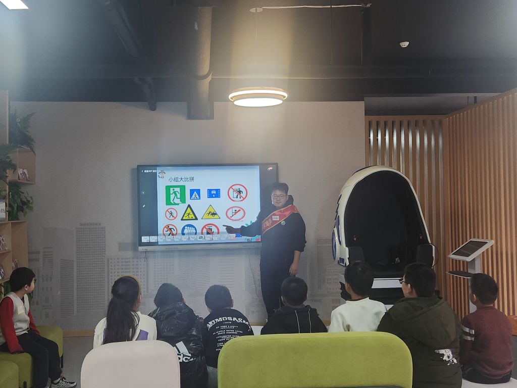活动后期,为帮助成员增强交通安全意识,养成良好交通习惯的目的,社工发动村居高中生志愿者力量,志愿者化身“讲解员”详细讲述日常交通安全标识、进行交通知识大比拼、带领成员观看汽车盲区短片。首先,志愿者通过呈现交通安全标识图片,向成员们讲解图片元素以及对应含义,帮助成员们快速有效记住重点。随后,将成员们分为两组,开展“交通知识大比拼”游戏,“这是人行横道的标志!”“这是注意车辆的标志!”“这是非机动车道的标志!”……场面十分激烈、难分胜负,经过多轮角逐,B组以一分之差战胜了A组。最后,社工通过展示一张SUV汽车车型照片,引导成员们猜测汽车四周可藏匿多少位小朋友,“20位!”“我数一数,前面,侧面,能藏6个小朋友!”……最终,社工通过放映汽车盲区短片揭晓答案——75个,成员们在震惊之余表示以后出门一定注意安全、远离车辆,不在汽车附近玩耍。