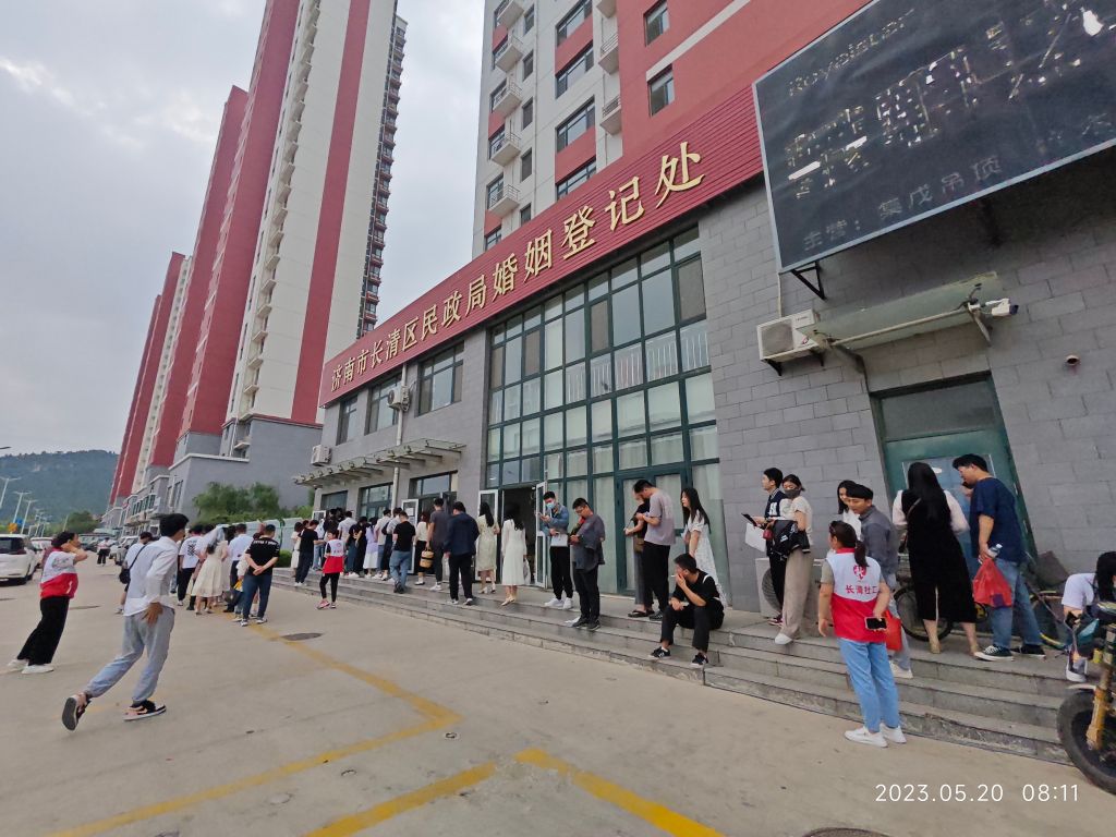 5月20日一早,长清区民政局婚姻登记处等待领证的新人就排起了长队,甜蜜的笑容绽放在每个人的脸上,长清区社工及新时代文明志愿者也早早的到位,协助维持秩序,以志愿行动维护美好爱情。看着忙前忙后的社工们,有的新人不禁发出疑问:“我看你们马甲上写着“长清社工”你们是干什么的?专门负责婚姻登记吗?”,现场的社工为新人澄清了自己的身份,向大家介绍社工站及社工服务,并表示有困难、找社工,每个街道都有一个社工站,站上的社工会尽自己最大的努力为大家服务!长清区民政局党组书记、局长王允松,党组成员、副局长许好军也为现场的新人送上了诚挚的祝福。