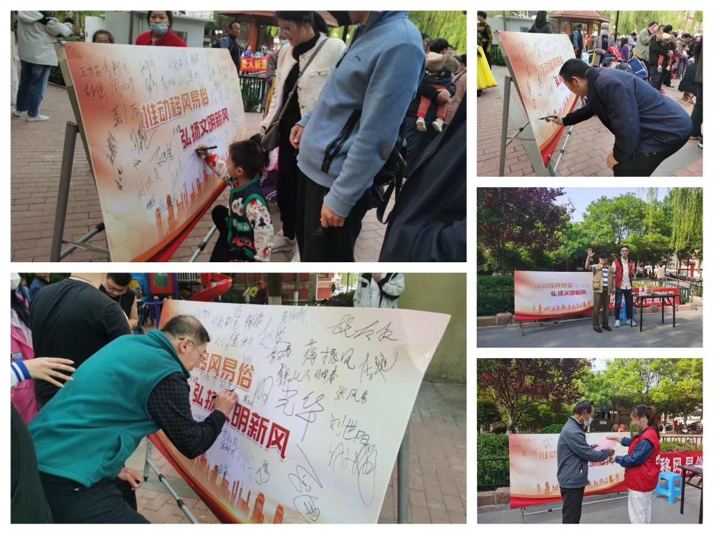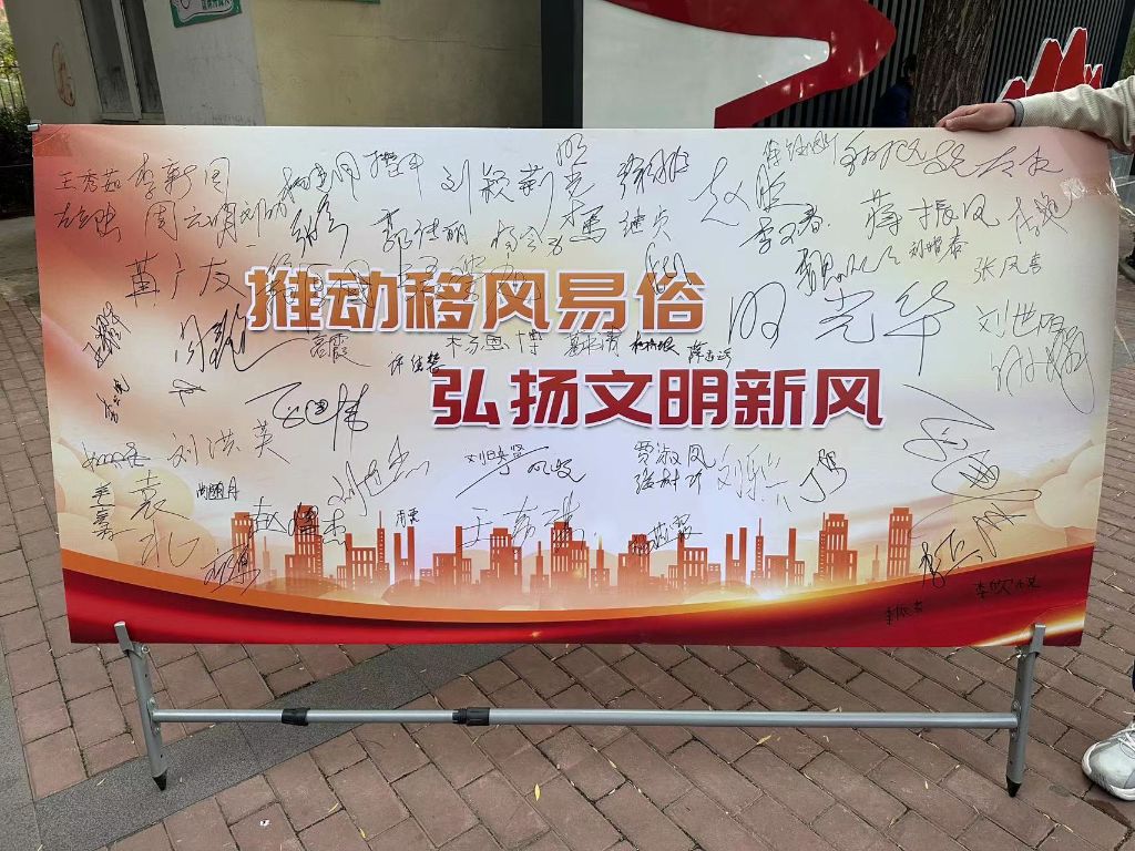 在活动现场,社工们向社区居民发放《倡移风易俗树文明新风倡议书》200余份,并向大家解读移风易俗的意义,倡议居民自觉抵制陈规陋俗和封建迷信,摒弃婚丧大操大办、高额彩礼、铺张浪费、厚葬薄养等不良习俗,引导居民群众从我做起,从现在做起,争做移风易俗的带头人。倡导文明节俭,树立婚丧嫁娶新风尚,彰显文明健康新理念,共同营造简朴纯洁的社会风气,共同建设文明社区,在辖区内形成涵养良好家风、淳朴民风、文明社风的浓厚氛围。同时活动现场设置了移风易俗签名板,居民们纷纷在签名板上留下自己的姓名,表达要弘扬社会文明新风,争做移风易俗的践行者。