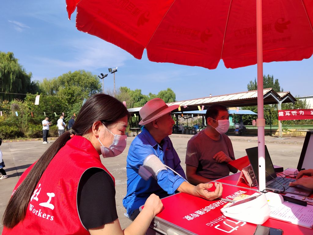 志愿服务区,社工链接志愿者免费为老人们提供听力筛查、量血压等志愿服务活动,志愿者细心为老人们测量血压,社工一旁用通俗易懂的语言为老人们讲解高血压的预防及注意事项,叮嘱他们注意日常作息、饮食习惯,以便有效的控制血压,把健康带回家。
