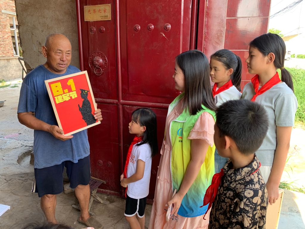 由于济南新旧动能转换起步区太平街道物产资源丰富,农业发达,社工带领孩子们制作献礼建军节的“八一”粮食粘贴画,既可以让孩子们真正感受到粮食的来之不易,又能让他们在创作中感受到国家的强大和自豪。经过孩子的不懈努力,粮食画终于制作完成了。随后,孩子们化身“红领巾”志愿者,跟随社工的脚步去往7名退伍老兵的家中,将自己亲手制作的“八一”粮食画送给他们,并一起听听守护家园、奋斗报国的故事。通过聆听退伍老兵的故事,让孩子们懂得有人付出守护,才能有我们的和平安稳;有人负重前行,才能有我们的自由欢笑。
