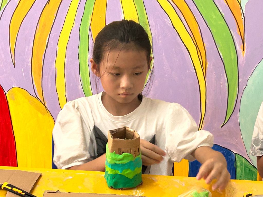 为让孩子们深刻体会到旧物回收利⽤再创造的神奇之处,社工带领孩子们将平时被视为废弃物的纸箱,通过巧手和创意,变废为宝。在社工的指导下,孩子们认真地将废弃的纸箱裁剪、拼接、黏合,并用彩色粘土加以装饰,每一个动作都透露出他们的专注和热情。有的孩子在制作过程中遇到了困难,但在社工和同伴的鼓励与帮助下,他们很快克服了问题,继续投入到创作中。