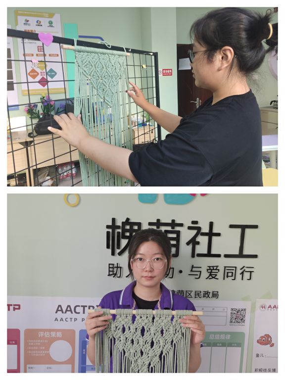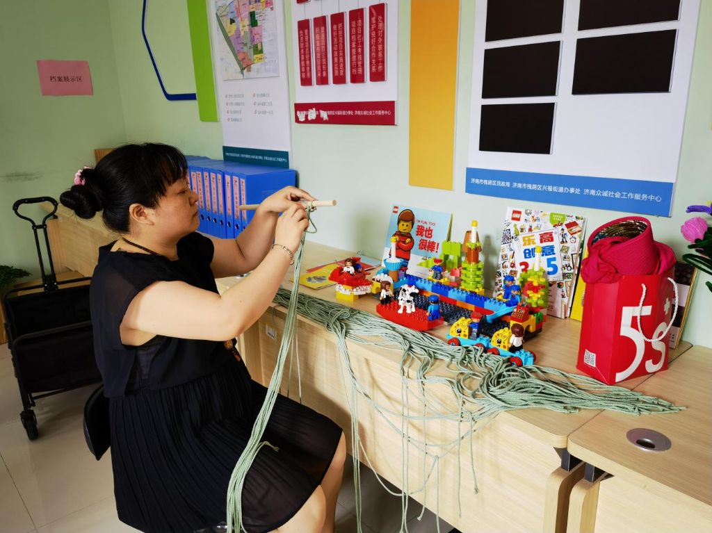 如往常一样,组员踏着学堂上课的钟声进入教室,开始了今天的学习,简单的麻绳很快就在组员的搭配中呈现雏形。“阿姨们,以后学堂中的产出,将用于咱们社工站的装饰,大家有什么新颖的意见可以向我们提出来”,本次活动中,社工以观察者和组员的身份参与其中,明显发现,以“情感”注入活动中,能更好地激发居民的参与热情。在一言一语的讨论中,组员充分发表了自己对于活动空间的打造的看法,进一步明确了社工站内空间打造的规划,大到门面装饰,小到角落物品的摆置,更凸显社会工作服务中“人”的参与感。
