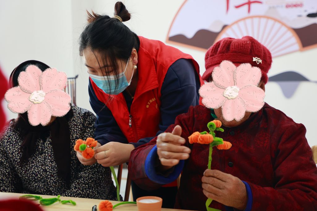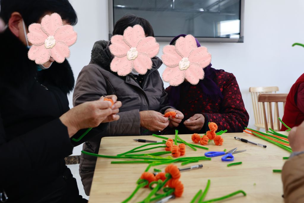 离过年也就一个月了,咱今天做个手工柿子花,祝大家喜事连连。”社工向大家展示需要制作的材料,只见社工双手翻飞,一个小小的手工柿子花便悄然成型,引得组员们惊奇不已。“这个柿子花很简单,只需要这样……”