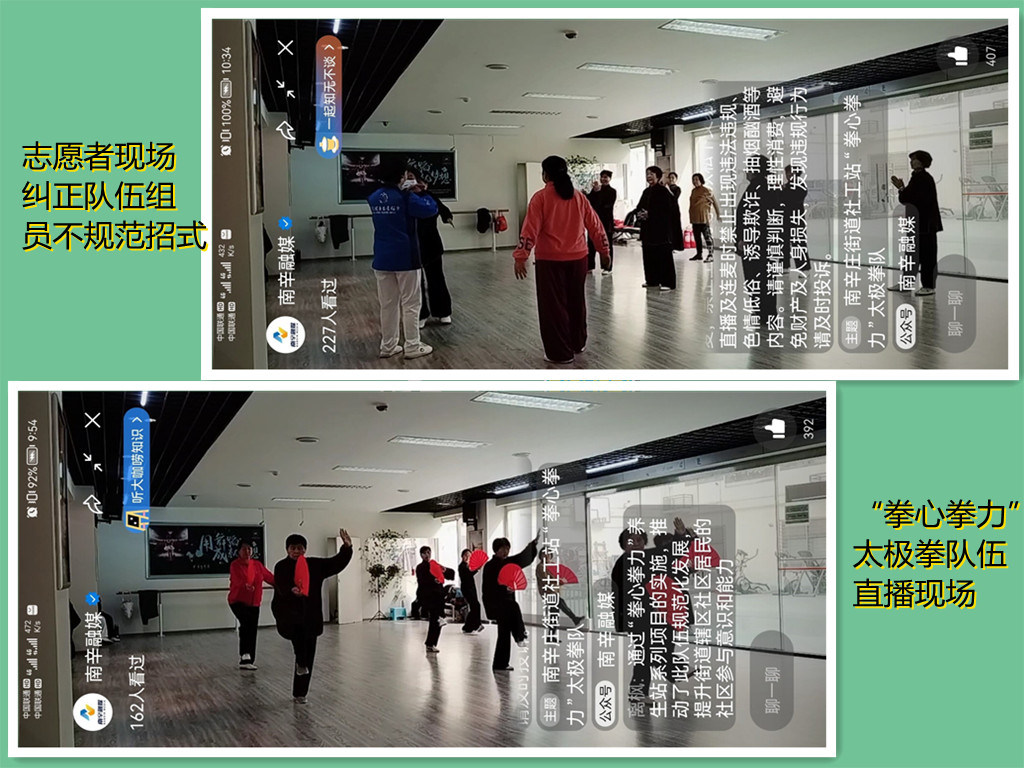 直播是指利用互联网和流媒体技术进行直播。视频因其融合了图像、文字、声音等丰富元素而逐渐成为互联网的主流表达方式,通过真实生动的传播,营造出强烈的现场感,吸引观看者的眼球,达到印象深刻、记忆持久的传播效果。为提升南辛庄街道社工站宣传力度及知晓度,规范社区社会组织队伍日常学习质量,南辛庄街道社工站就当前直接服务的社区社会组织日常参与社区活动情况,积极与街道多媒体中心对接,通过政府媒体渠道现场直播的方式来扩大社工站服务的宣传力度。10月13日,社工站服务的“拳心拳力”太极拳队伍迎来了首秀。