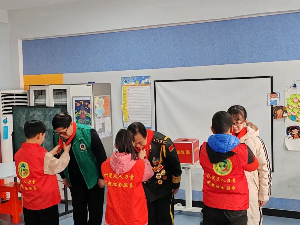 互动环节,更是充满了浓浓的温情。小朋友们手捧着鲜艳的红领巾,脚步轻快而又小心翼翼地走向李爷爷和刘爷爷。他们踮起脚尖,眼神中满是庄重与虔诚,轻轻地为两位爷爷系上红领巾。那一双双小手,虽然还有些笨拙,但每一个动作都充满了爱与敬意。系好红领巾后,孩子们仰起小脸,望着两位爷爷,脸上洋溢着自豪的笑容。刘爷爷慈爱地摸了摸孩子们的头,然后和他们围坐在一起,亲切地和孩子们交流,他温柔地给孩子们讲述着每一件勋章背后的故事,孩子们则紧紧地簇拥在他身边,眼睛睁得大大的,充满了好奇与惊叹。有的孩子忍不住伸出小手,轻轻触摸那些珍贵的勋章,仿佛这样就能更贴近那段历史,更靠近心中崇拜的解放军英雄们。