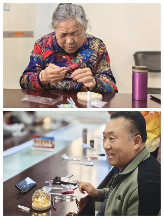随后,志愿者带领大家制作郁金香云朵灯,大家兴致十足,学得十分认真。“这个环节怎么弄呀?”时不时就有阿姨、叔叔举手寻求帮助,志愿者们微笑着一一讲解、指导。“先解开灯串,穿过底座,再将郁金香小灯一个个串起来,用胶水固定在灯罩上,最后盖上玻璃盖子,打开电源,小夜灯就制作完成了。”过程中小组成员们也在互帮互助,相互展示着自己的成品,现场不断传来欢声笑语,尽情地享受着过程的乐趣。