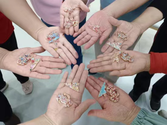 活动伊始,志愿者老师首先向居民们介绍了非遗螺钿:螺钿是中国特有的传统艺术瑰宝,是用螺壳与海贝磨制成人物、花鸟、几何图形或文字等薄片,根据画面需要而镶嵌在器物表面的装饰工艺。社工将提前准备好的制作螺钿胸针所需的材料分发下去,接着协助她们在老师的带领下一步步制作。通过将片片的螺钿贝壳片堆叠起来,逐渐出现了富有层次感的图案。在活动开展的同时,社工引导着居民们通过分享故事等方式回顾母亲或者身为母亲的那些温馨时光,让本次的手工艺品有了爱的意义。胸针完成后,居民都兴致勃勃地介绍、分享自己的作品,并且将制作好的胸针戴在胸前,脸上洋溢着满足和自豪的笑容。