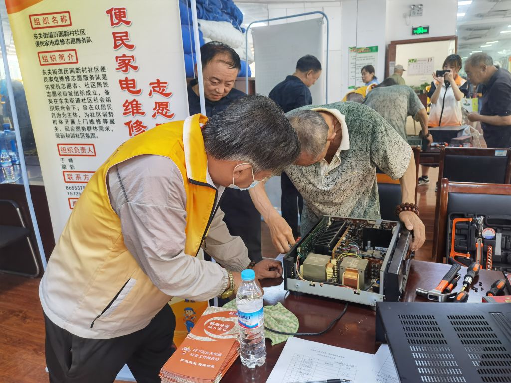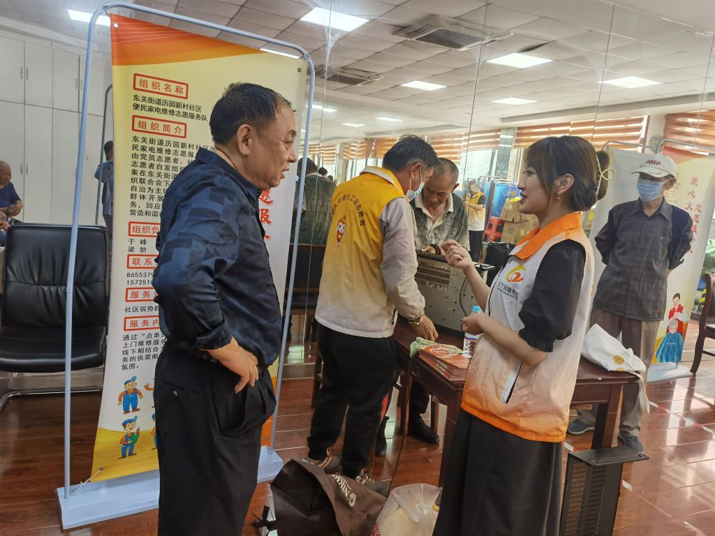 在一旁的便民维修区域,收音机、电磁炉、电饭锅、手电筒等各式各样的家用物品都在等待维修,组织成员们细心地在登记表上记录物品名称、物主姓名,现场排查电路故障,更换损坏零件。对于无法快速解决的问题,组织成员们耐心地向居民解释电器损坏原因,说明维修后的最快领取时间并普及了日常家电保养维护的注意事项。“这些东西不是很贵但很容易坏,只是一点小问题,拿去修又不划算,没想到梁老师这么快就帮忙修好了,咱们社区里真的处处是能人!”杨阿姨大声称赞道。