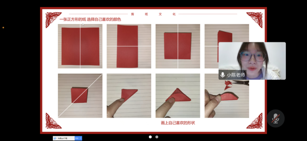 首次活动在社工的带领下,小组成员了解了小组活动的目的、意义,向大家申明了小组活动的规则,要求同学们按时上课,遵守课堂规则并及时提交作业。社工通过线上互动小游戏,引导小组成员进行自我介绍,打破小组成员之间的壁垒,有效增进了小组成员的熟悉程度。大学生志愿者对剪纸的历史、意义、四大技法、具体要求等做了详细的介绍,引导儿童尝试用基本的剪纸工具和薄型材料,表现简单的窗花纹样,体验剪纸创作的乐趣。