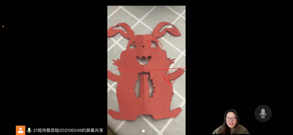 第二节活动中社工带领儿童对上节课的小组规范及活动内容进行回顾,并对大家发至群内的作品进行依次点评。志愿者讲解了民间生肖故事,播放了有关兔年的纸艺视频,针对不同年级的同学进行分组教学,高年级与低年级进行不同的课程学习,这样可以降低低年级同学的学习难度,更好的进行学习。