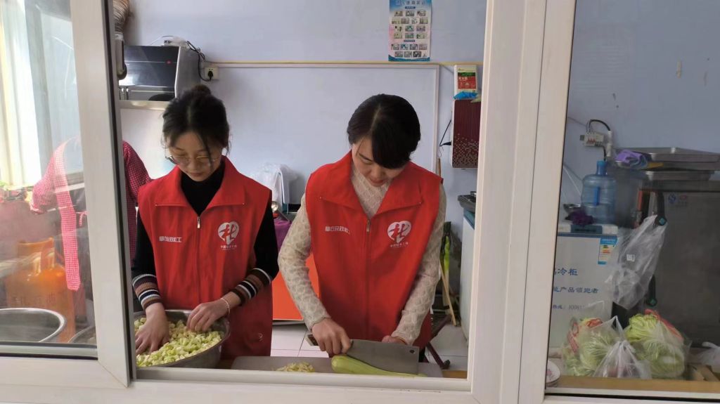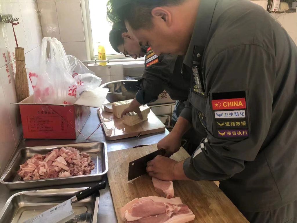 城际救援队5名志愿者带着食材前往官庄街道郑家寨村幸福院,来到厨房立刻忙碌起来,有的帮忙打下手,切肉、切豆腐、洗菜。另外几名没在厨房找到活儿的志愿者则来到院子里打扫卫生,还有几名志愿者陪晒太阳的老人聊天,大家都各自做着力所能及的事。