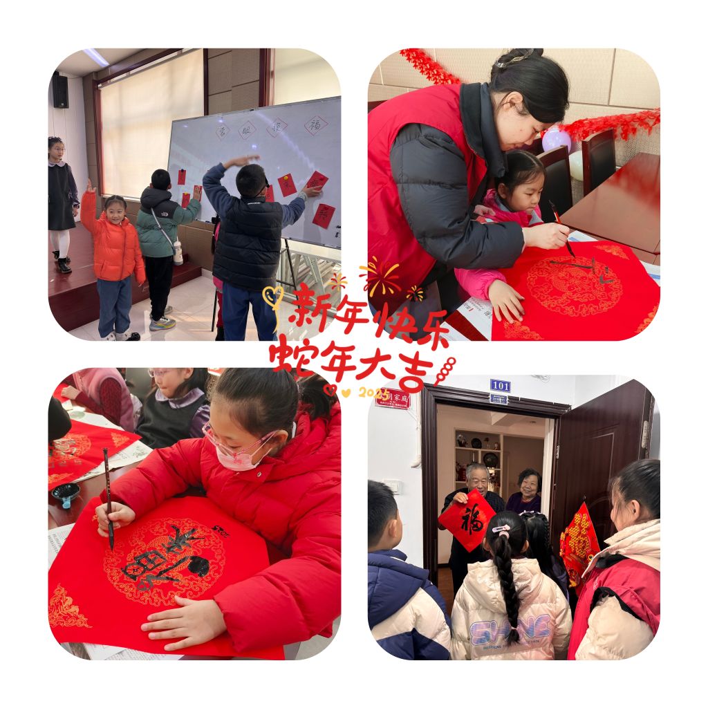 活动伊始,社工引导小营员们一起制定小组契约并共同遵守。通过“蒙眼摸福”等破冰游戏,小营员们彼此建立友谊的同时,还对 “福字” 这一传统元素有了初步认知。在深入了解春联和福字的历史故事后,小营员们拿起画笔,尽情发挥想象力,绘制出一幅幅充满童真的卡通福气蛇。随后,孩子们跟随社工一起走进社区,帮助老人们张贴福字和春联,将新年的祝福传递到社区的每一个角落。
