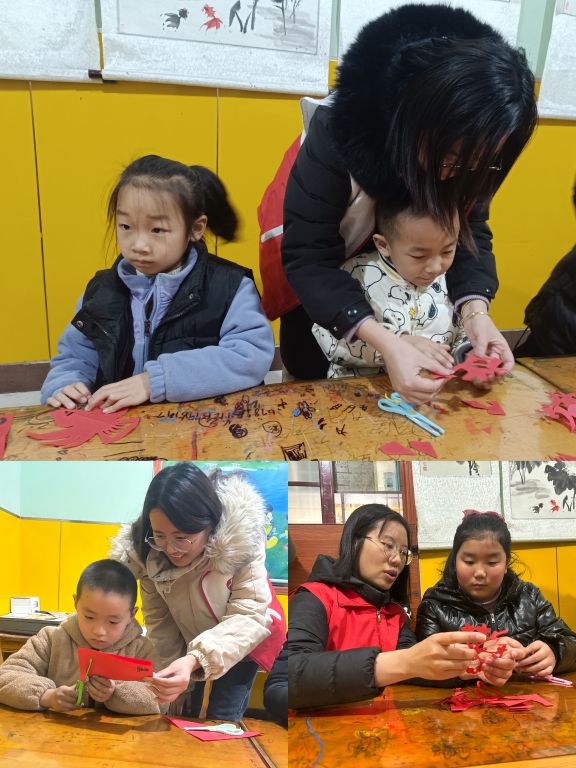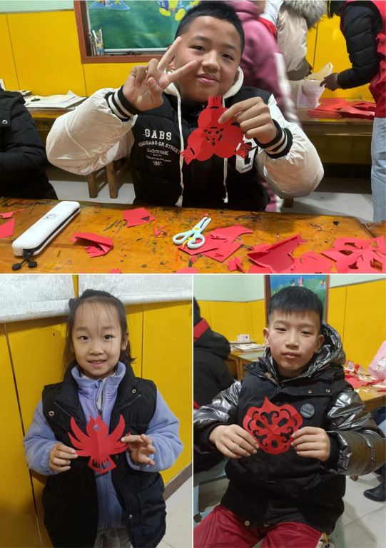 “老师,你看,我剪的这朵小花好看吗?”“老师,这里该怎么剪啊,你能帮帮我吗?”……活动现场一片欢声笑语,热闹非凡。在志愿者的耐心指导下,每位同学都认真地舞动着自己的小手,先折一折,在剪一剪,都剪出了属于自己的作品,小雪花、福字、灯笼……一个个喜庆的图案让同学们笑开了花,一幅幅美丽的窗花惟妙惟肖,绽放开来。