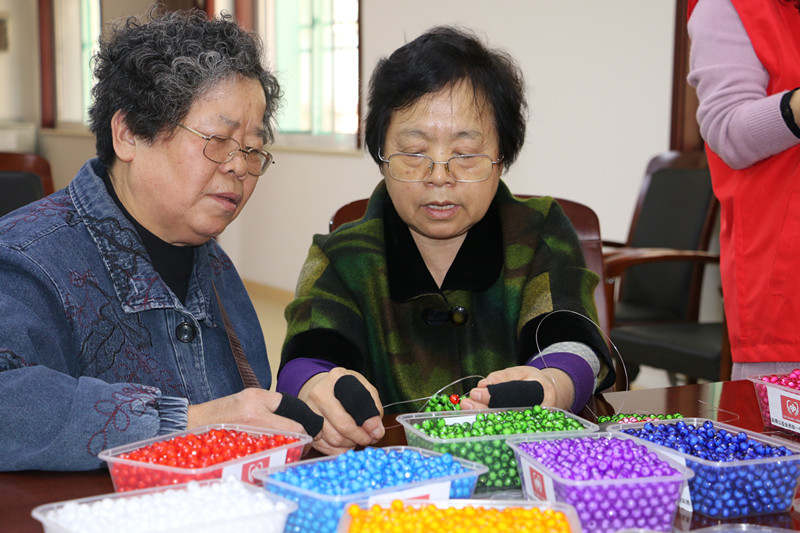 事先报名的老人准时到达了活动现场,活动现场五颜六色的水晶珠、形象各异的串珠作品,很快吸引了老年人的注意,老人先是惊叹简单的塑料珠竟然可以编出这么好看的东西,随后又担心自己学不会这项技能,社工很耐心的给老人进行讲解,还从最基本的基本功开始教授,这给现场的老人吃了一颗定心丸,现场的每位老人都很快进入状态,学习的很认真。