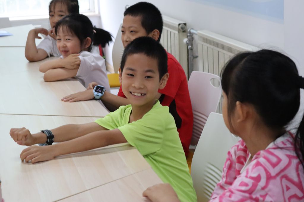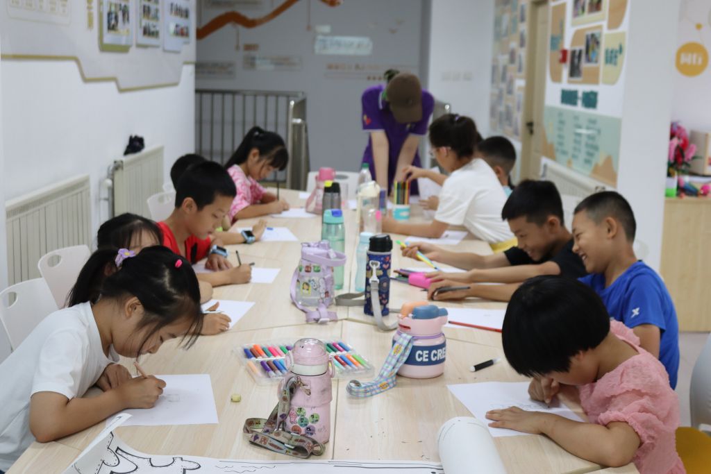 欢乐开营,我们初相识。活动开始,社工带领营员们做自我介绍,并通过击鼓传花的方式帮助营员们快速熟悉起来,“传表情”,“逛三园”等小游戏更是让气氛逐渐热闹起来。接着,社工向营员们介绍夏令营活动的目的、流程安排、注意事项,让营员对夏令营有基本的了解。社工引导营员思考小组契约内容,每人上台介绍自己的观点,其他营员举手表决,并将一致通过的契约内容书写在小组契约书上。最后,社工引导营员们发挥想象,在白纸上一笔笔画出专属自己的职业梦想自画像。有的小朋友画出了穿着医生制服,手持听诊器的医生;有的小朋友则画出了站在讲台前,手持教鞭的教师;还有的小朋友画出了驾驶着飞船,遨游在宇宙中的宇航员……每一幅画都凝聚了孩子们对未来的憧憬和梦想。