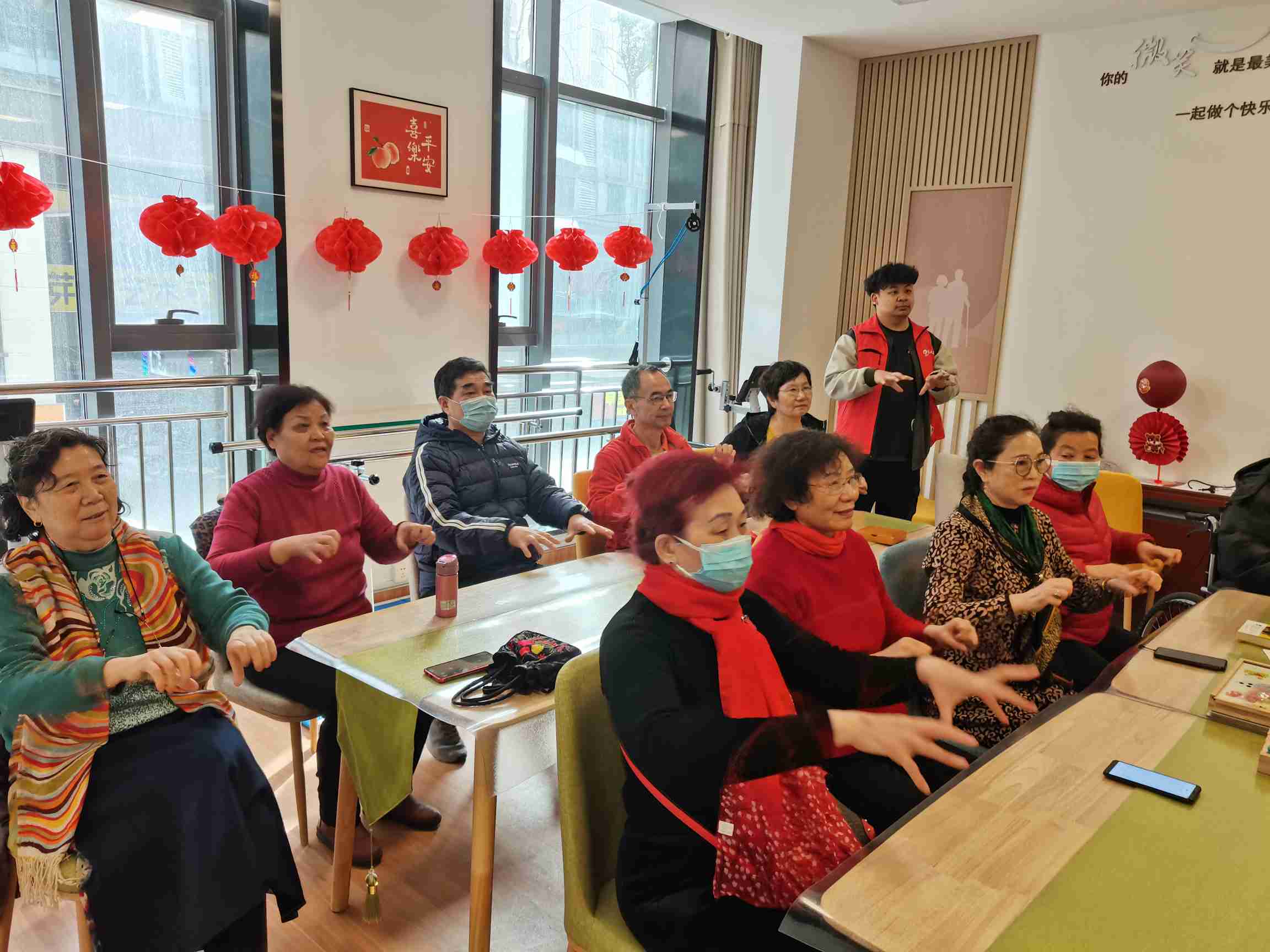 “握拳放松、十指交叉互击、手背互击……”,活动现场,社工向老人们教授“健脑手指操”,社工一边示范一边讲解手指活动的重要性,比如可以帮助活动手部关节、增加血液循环、减轻精神负担、改善睡眠等。老人们认真听讲,积极参与,跟着社工舒展手掌,认真地做好每一个动作和细节,现场洋溢着温馨的气氛。