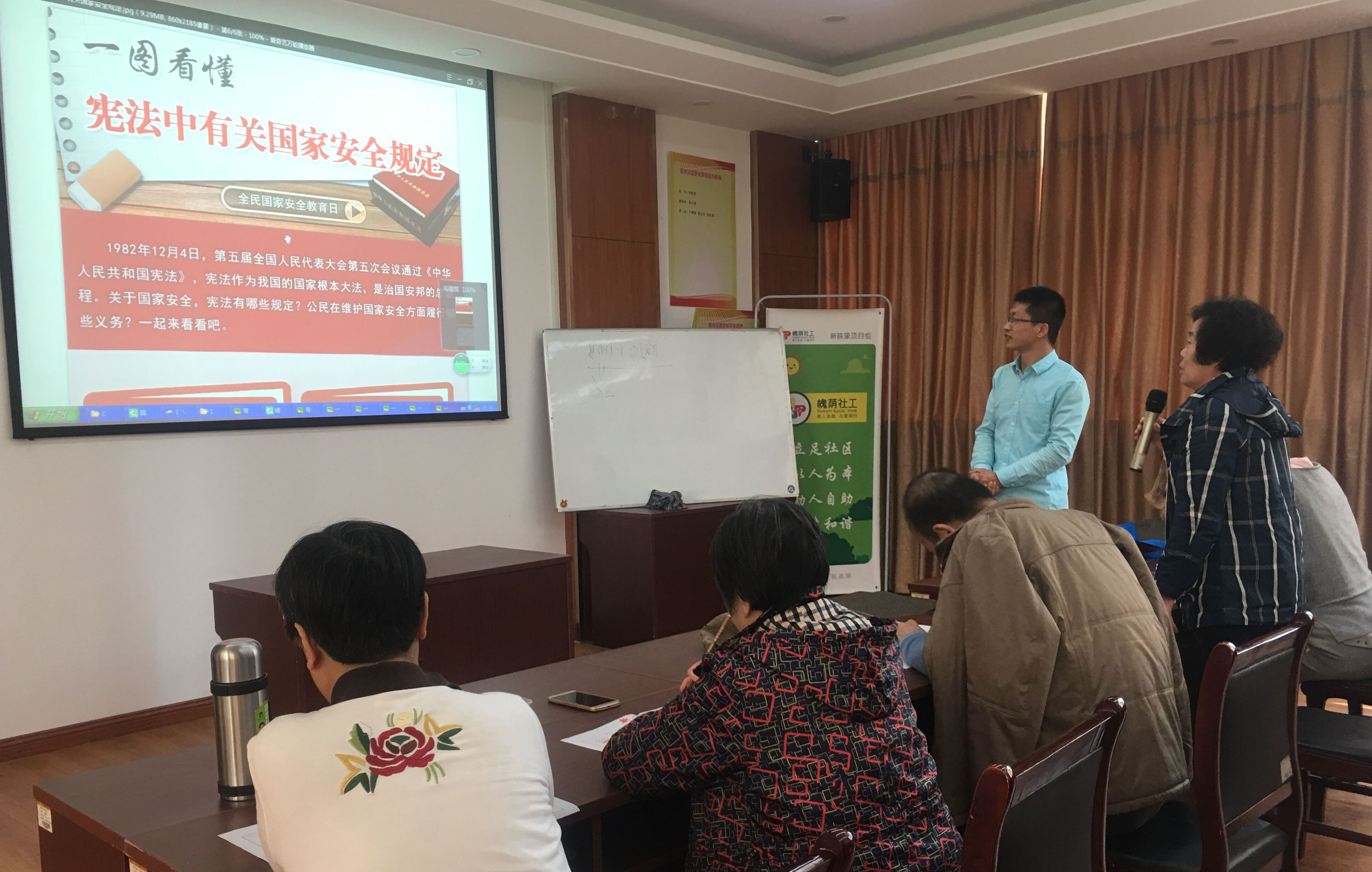 普法宣传讲座上,社区社工结合中国普法网推出的“一图看懂国家安全法”、“一图看懂网络安全法”等图解向文化志愿者由浅入深地剖析了如何从身边小事做起维护国家安全。讲座上,文化志愿者还通过朗读接力,即时问答等形式加深对公民、组织应履行的义务和享有的权利等知识点的理解。