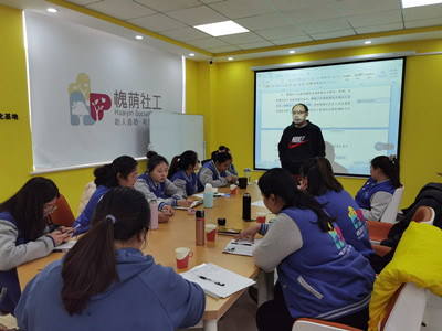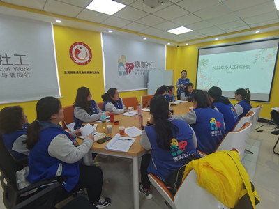 会上,各社工站以PPT汇报的形式进行深入交流,思考上一年度工作中存在的短板,同时结合实际情况提出了2022年的工作思路。在汇报结束后,大家运用“4F”专业技巧说出“事实、感受、发现、未来”,社工们拧成一股绳,互相出谋划策,结合自身服务经验探讨出了问题的解决方案。