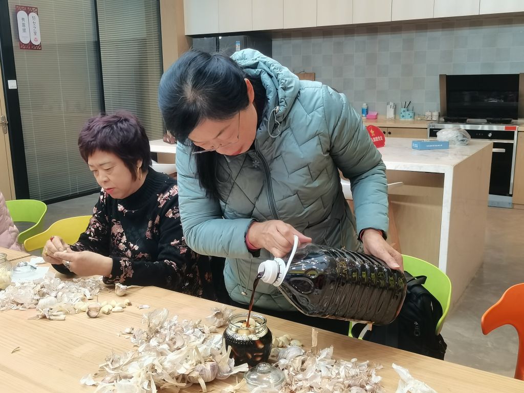 活动现场,首先由社工为居民们讲解腊八节的相关习俗。随后,社工将准备好的玻璃瓶、大蒜和米陈醋摆放在桌子上,居民们齐动手,一边动作娴熟的剥蒜瓣,一边分享近期趣事,现场一片其乐融融。最后,社工强调腊八蒜要泡足二十天,等蒜变成翠绿色就可以吃了,既可以解腻还有预防感冒、防止肠道疾病的功效。“今天就是腊八节,大家伙儿在这里一边剥蒜,一边聊天,既加深了邻里之间的感情,又能对这个传统节日的历史加深了解,做一个传承,这个活动真有意义。”王阿姨说到。