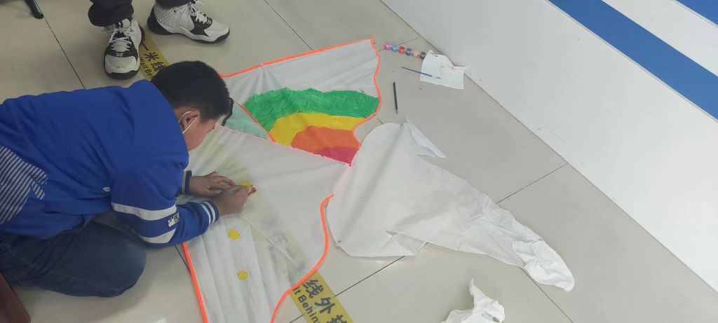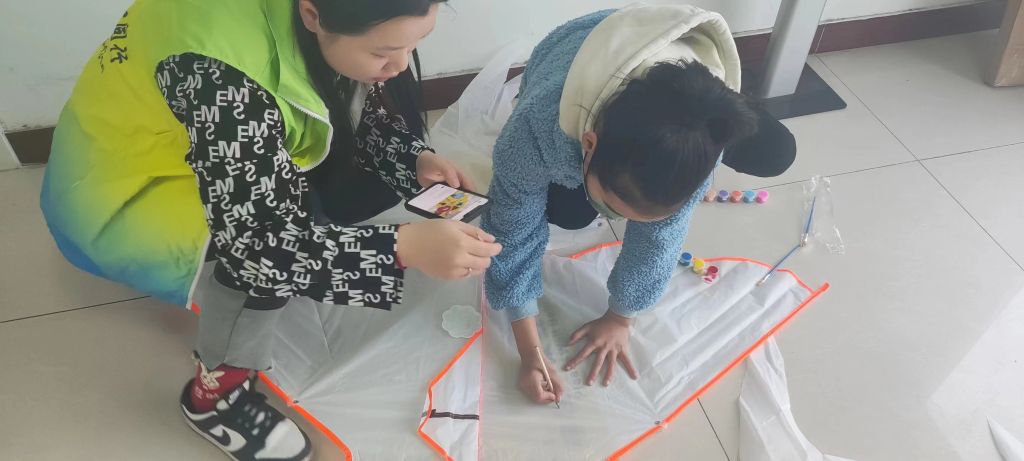 孙耿社工陪着孩子们在风筝上任意涂鸦,画出他们心目中的春天,孩子们发挥自己的想象力肆意作画,在风筝上画出了欣欣向荣、莺歌燕舞的春天。绘画过程中,“小画家”们个个热情高涨,大家相互交流、相互配合,充分发挥想象力和创造力,动手画出了一幅幅五彩斑斓的风筝。通过手绘风筝让困境儿童近距离地感受传统文化的魅力,丰富课余时间、增强动手协调能力、营造儿童之间的和谐氛围,在绘画中感受自然,亲近自然。