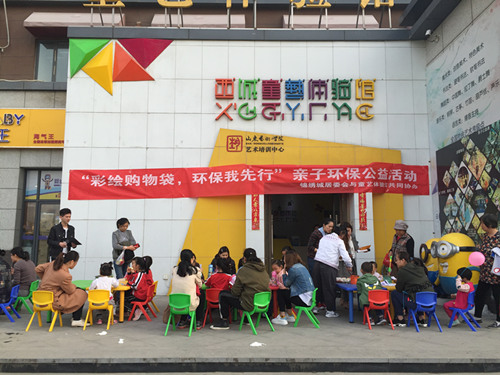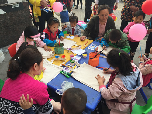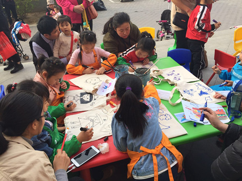 下午五点,家长们与小朋友们大手牵小手地来到活动场地,在社工工作人员手中领取了相关画材之后,便在家长耐心、细心的合作下制作着专属于自家的“艺术品”,不一会儿,一个个卡通图案、一副副风景图案都展现在空白购物袋上。购物袋上没有了一丝空白,孩子们的想象是那么的精彩和无尽,在斑斓的色彩中淋漓尽现。