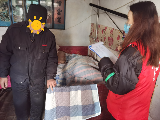 活动中,每到一户人家,社工们都会跟老人认真交流,详细记录他们的基础情况、经济状况及辅助用具的使用情况,提醒他们天冷注意添衣保暖,生活中要时刻注意取暖安全、预防一氧化碳中毒事件的发生。同时,鼓励他们要保持积极乐观的心态并送上棉被、面粉等生活物资,交谈过程中老人们脸上洋溢着笑容,并感谢党和政府的关怀以及社工对他们的关心和慰问。
