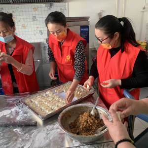 一大早,普集社工站驻站社工和志愿者们在就来到上皋日间照料中心厨房,分工协作,开始洗菜,调馅,和面,擀皮,包饺子,每个人都忙的不亦乐乎,经过一个多小时的努力,一盘盘饺子就包好了,等待着老人们到来。