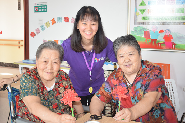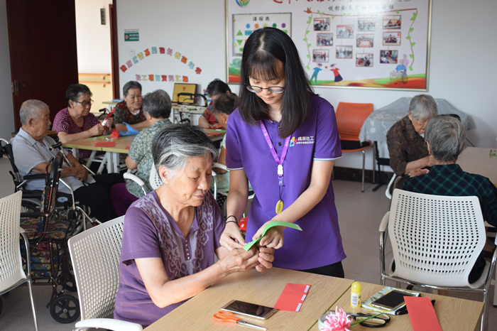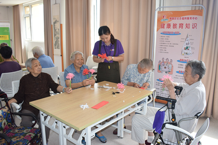 活动伊始,很多老人好奇这是什么花,社工先是从这个“曼珠沙华”名字的由来向老人介绍起来。老人们听得很是认真,故事讲完,切入今天的正题,开始了曼珠沙华的制作过程。折、剪、粘,看似简单的过程,老人们却乐在其中,做完一朵又接着一朵。每人手中一朵红色一朵粉色,看着自己制作的成果,老人们甚是满足。