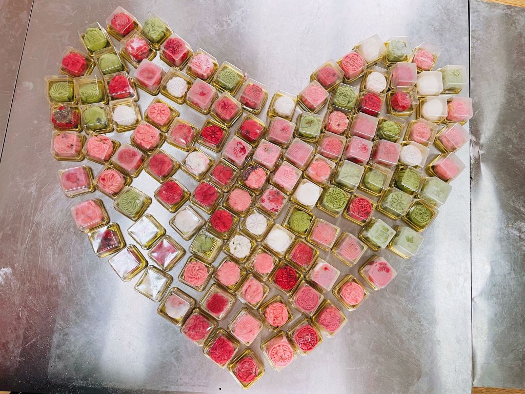 动手做月饼是大家最期待的一个环节,社工提前准备好制作冰皮月饼的材料,边示范边讲解制作月饼的步骤,鼓励他们大胆动手尝试。揉面团、放馅料、包月饼、压模具、装盒子……奶奶们与孙辈们相互配合,分工合作,不一会儿,一个个包裹着不同馅料精致美味的冰皮月饼就做好了。