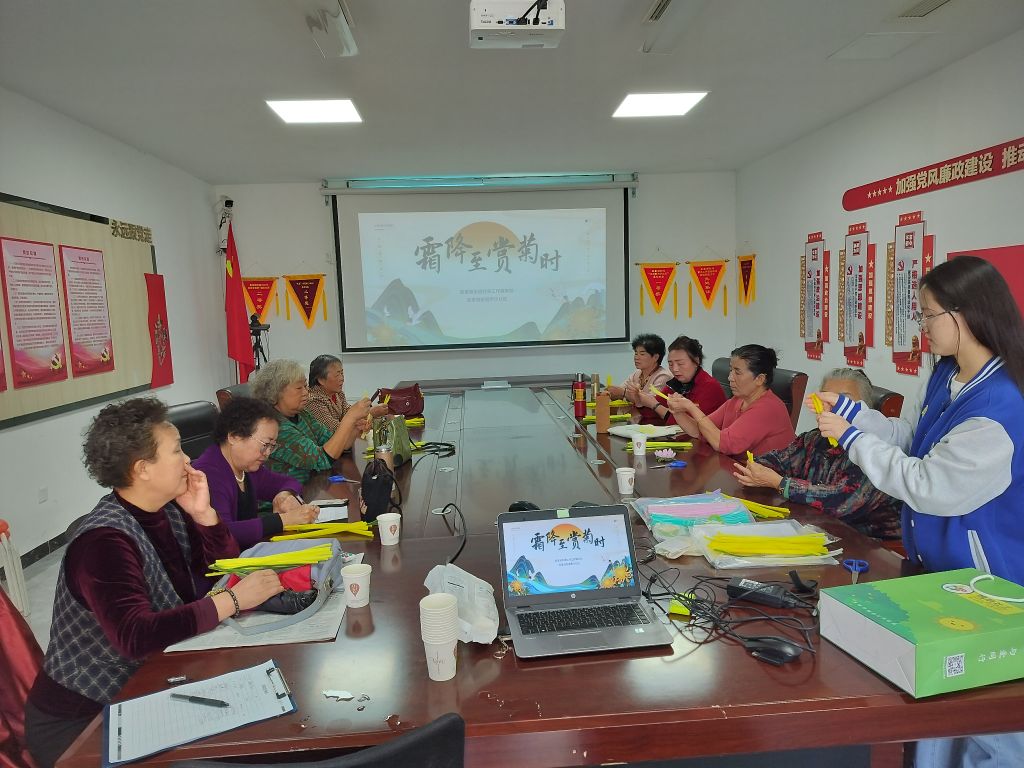 霜降,中华民族农耕文化代表之一——二十四节气中秋天的最后一个节气,也是秋季向冬季的过渡,天气渐凉,昼夜温差增大。农谚云:霜降见霜,米谷满仓。霜降是一年中收获、播种的最后时节。古有“霜打菊花开”之说,“霜降”前后,正是菊花盛开的时期。菊花被古人认为是“延寿客”“不老草”“候时之草”,成为生命力的象征。千百年来中华民族素有赏菊饮酒的传统风气,赏菊亦成为霜降这一节令的雅事。特此,社工组织西沙社区老人们一起动手制作“菊花”,在社工的演示和耐心教导下,老人们手执各色细长扭扭棒,一转一拧,一扭一黏,很快一朵朵灿烂盛开的菊花就在老人的手中诞生了,看着自己亲手制作的菊花,老人们情不自禁的洋溢着幸福的笑颜。大家你一言我一语,彼此欣赏菊花,谈笑风生,好不惬意。