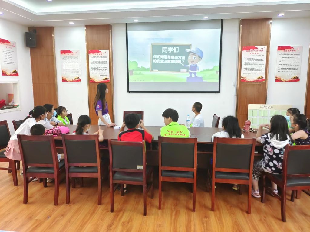 沉浸式的课堂润心间。安全教育“不放假”,社工站精心设计了一场20分钟沉浸式的有关安全教育主题的课堂,在课堂上,“蓝精灵”们纷纷担当安全教育的“知识宝库”,向课堂中的小伙伴们分享自己所掌握的的安全教育知识小技巧,从暑期的防疫安全、用电安全到食品安全、防溺水安全和交通安全面面俱到,整场课堂热“聊”十分。在整场安全教育课堂中,社工站社工引导“蓝精灵”们增强自我保护的意识,安全防护谨记心间。