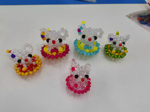 活动伊始,项目社工简单说明本次串制蓬蓬裙老鼠是为迎接即将到来的鼠年而制作的年景作品。随后社工就蓬蓬裙老鼠的制作技巧及注意事项做了说明,并将讲义及准备好的珠子分到成员手中。有了两个月的学习积累,成员们对串珠技巧、熟练度已经有了一定的基础,此次制作过程中,就个别成员制作时过线回原点的问题,社工借助老鼠成品现场进行演示和讲解,成员们根据社工的讲解互相交流沟通,个别年龄偏大制作缓慢的成员社工单独教授,确保大家的作品能同时完成,经过两个小时的串制,一只只俏皮可爱的蓬蓬裙老鼠呈现在大家面前,成员们相互欣赏并评价着彼此的作品。此次“鼠你兴福,手工制作”活动也迎来了尾声。