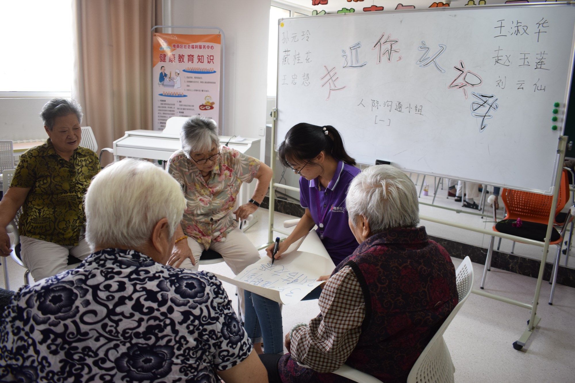 项目前期,社工通过兴趣小组和走访的形式和住养老人建立了良好的专业关系,并通过参加活动使老人彼此熟识,为从“心”开始人际沟通小组的筹备打下了基础。9月6日,悦银龄养老社工项目组在福利中心三楼老年大学开展了从“心”开始人际沟通小组的第一节活动“走近你,认识我”。