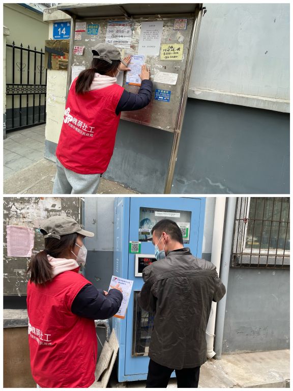 社工在社区宣传栏张贴社工站海报