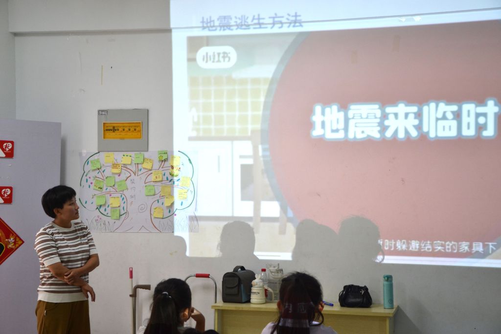 第三节小组活动围绕着防地震教育主题进行,帮助孩子们掌握避险逃生、自护自救的方法,提高大家的安全防范意识和应对地震的避险逃生自救能力。社工向孩子们讲解地震的类型、前兆,以及遭遇地震时如何正确的逃生,引导孩子们学习防震减灾小知识,时刻将安全挂于心间。