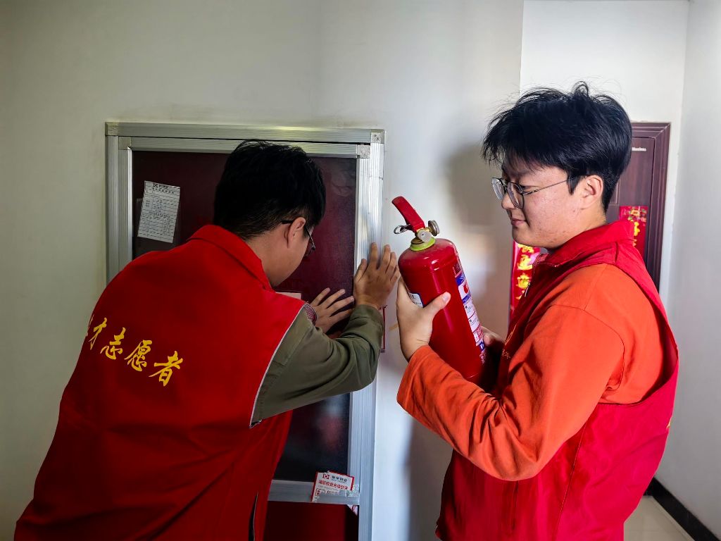 与此同时,另一组大学生志愿者们在站点社工的带领下在社区楼道内忙碌起来。他们仔细检查楼道内的消火栓,查看设备是否完好有效,确保消防设施在紧急情况下能够正常使用。他们还在楼道内张贴反诈宣传单,进一步扩大反电信诈骗宣传的覆盖面,让居民们在日常生活中随时随地都能了解到反诈知识。
