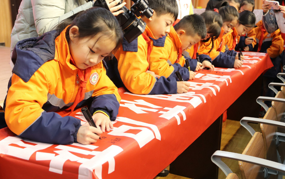 活动中,文昌街道城关派出所民警司家园首先进行烟花爆竹安全隐患宣讲,向学生、教师群体讲解燃放烟花爆竹的危害、呼吁大家应该自觉遵守相关法律法规,不购买和使用非法烟花爆竹产品,如遇违法违规行为,可以进行劝阻或报警。随后由学生代表宣读倡议书,并为宣传小卫士代表发放聘书,鼓励他们用实际行动共同保护环境、建设美丽家园。文昌街道社工站站长对线上活动操作流程进行讲解,鼓励儿童参与线上活动,通过“线上+线下”两种方式相结合有效提高儿童与家庭的活动参与感,促使活动效果最大化。活动最后,凤凰路小学副校长魏燕进行讲话,提升青少年安全意识和能力,老师、学生代表在倡议条幅签字,用实际行动践行环保行为。