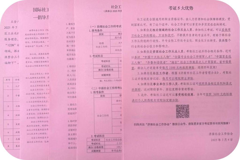通过发放济南市社会工作协会编制的《社会工作者职业资格考试指南》《社工证好处和骗局》,社工推广社会工作者职业资格考试。现场有不少年轻的居民咨询社会工作者职业资格考试报名及社工岗位就业情况,社工向居民一一讲解。