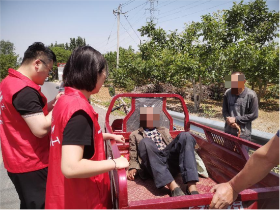 曹范街道民政所所长李师强看到信息后,第一时间将此情况反馈给社工,并安排前往救助。社工接到通知后立刻赶赴现场,进行危机干预,确保服务对象生命安全。在赶往目的地的途中,社工充分发挥纽带和资源整合作用,联系黒峪村书记询问老人的情况,经多方打听后,最终确认老人是南曹范人。随后,社工联系南曹范书记并通知其家人前往接应。