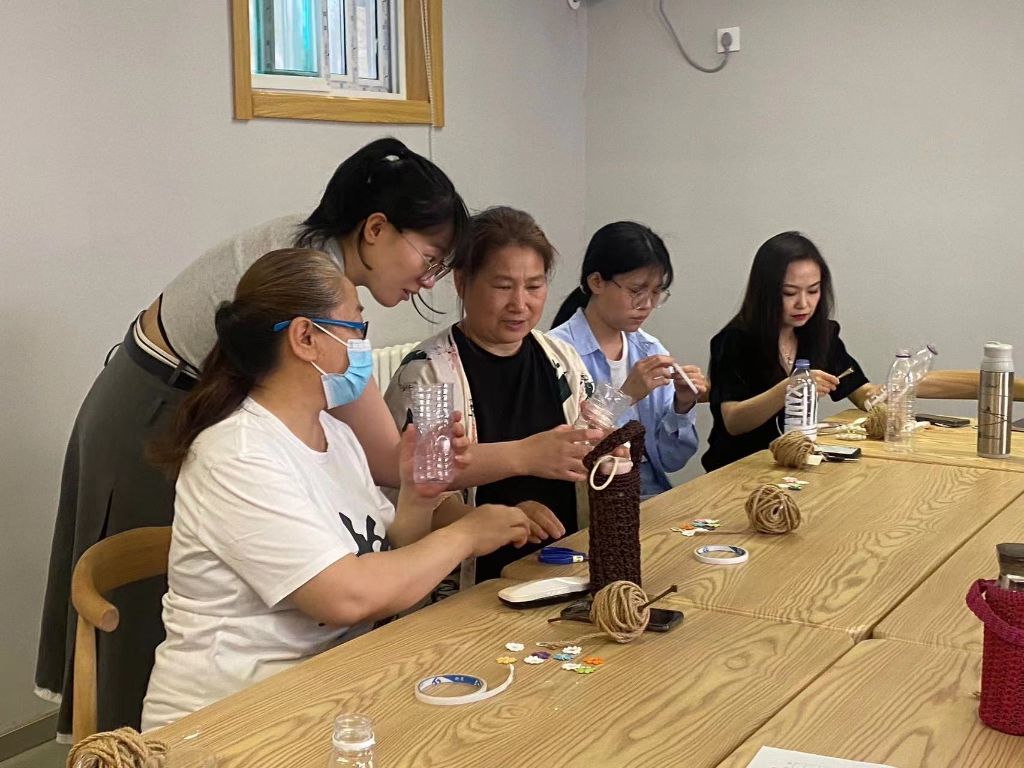 居民迫不及待的动起手来,将饮料瓶用麻绳缠紧,然后选一些装饰品按自己的喜好把瓶子装饰成自己喜爱的花瓶。一个个废弃瓶子经过大家们的巧手,脱胎换骨变成了一个个精美的花瓶。