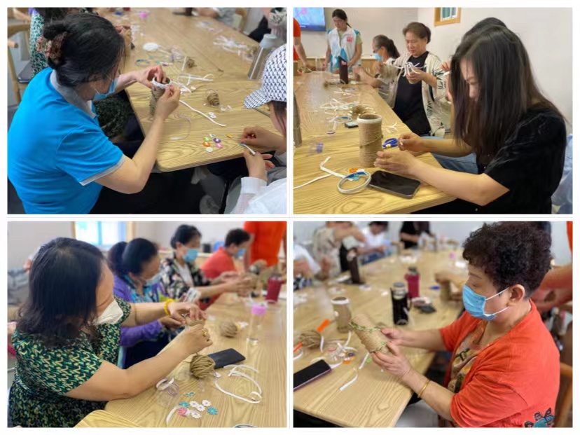 首先,社工为组员们讲解了本次活动的主题。活动正式开始,社工把准备好的彩色麻绳、装饰亮钻、蕾丝小花、双面胶等物品发放给居民,简单的介绍了制作方法。